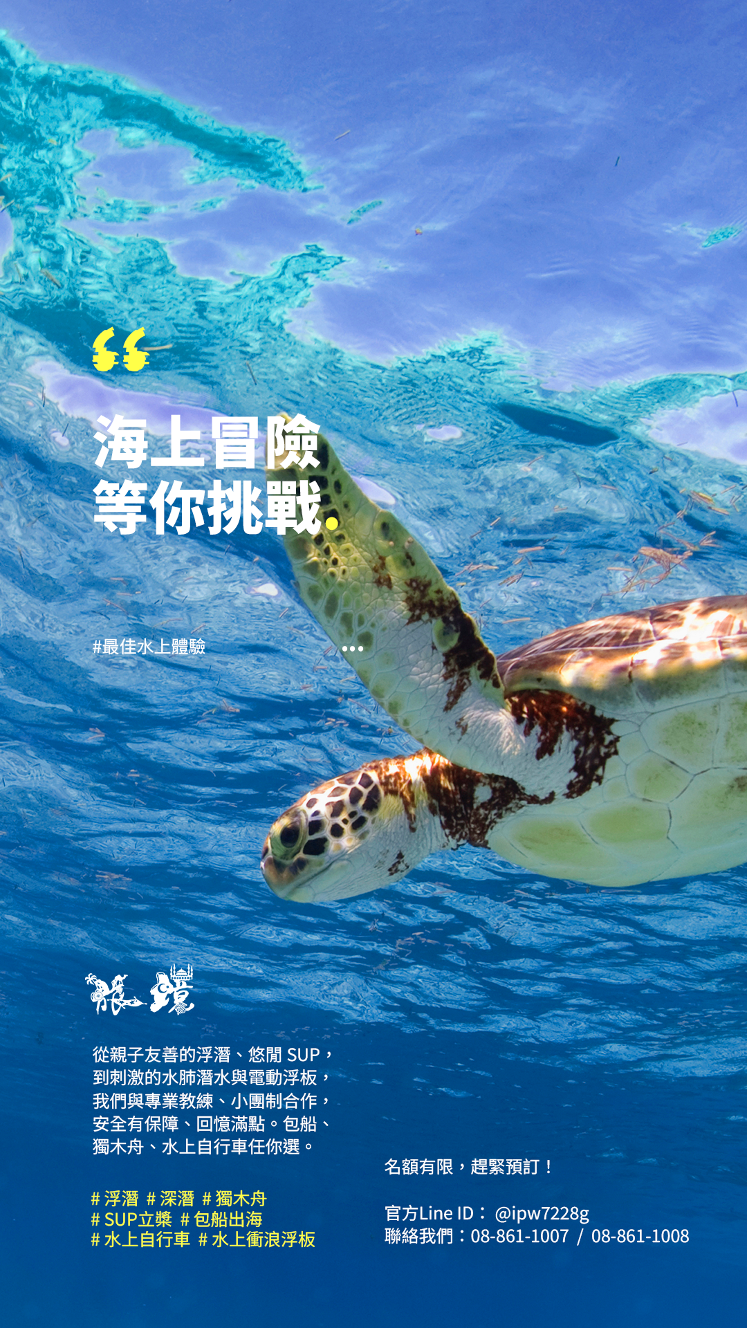 我們與專業合作夥伴攜手,提供安全、愉悅且適合各年齡的小團制活動:從親子友善的浮潛與悠閒SUP,到刺激的水肺潛水與電動衝浪浮板,還有獨木舟、水上自行車與私人包船出海。透過我們代訂,您享有優惠價格、完善器材、接駁安排與專業導覽,還提供拍照建議與安全說明,讓每一次下水都安心又值得回味。