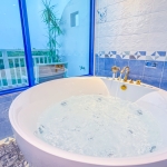 專屬陽台上的椅子靜靜等待您坐下,與天空與小琉球對話。這間觀景泡湯雙人房,為您與伴侶保留了一份專屬的私密浪漫。房內加大雙人床柔軟舒適,讓一夜好眠不再是奢侈;泡澡浴缸則是靈魂所在,您可以在浴缸裡放鬆身心,一邊享受按摩淋浴水柱的洗滌,一邊透過大窗將美景盡收眼底。不僅僅是泡澡與放鬆,這裡的體驗更像是一場沉浸式的療癒旅行。