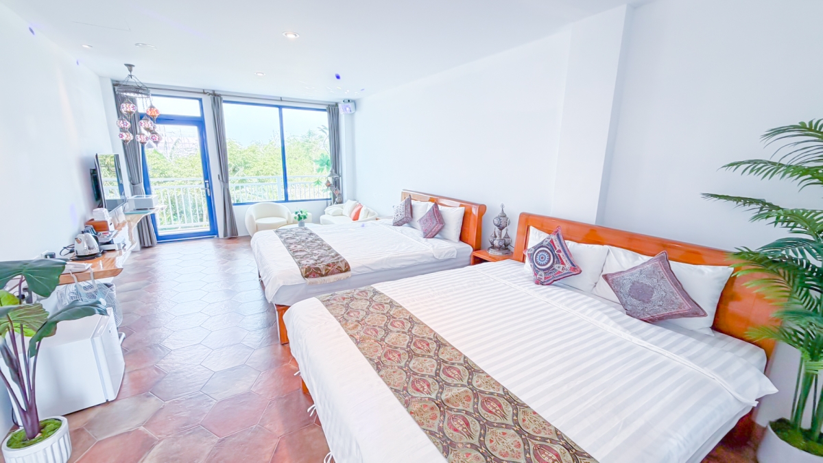 與家人或好友一起旅行,總需要一個能讓大家真正「聚在一起」的空間。景觀泡湯四人房以15坪的寬敞格局,提供兩張6×7尺特大雙人床,讓每位旅伴都能享受舒適睡眠。專屬的獨立陽台,設有休閒椅,白天可以遠眺藍天小琉球,夜晚則能成為談心的小天地。無論是迎接日出的清晨,還是微風輕拂的星夜,陽台的每一刻都自帶一種療癒氛圍。進口磁磚與特色燈飾點綴空間,更增添異國度假的氣息。這間房不只是一個過夜的地方,而是讓「相聚」成為旅程核心的舞台。笑聲、回憶與溫暖,會在這裡悄悄蔓延開來。